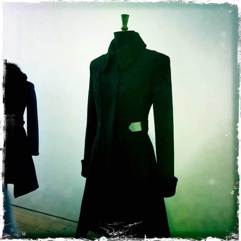 The collection itself is displayed on mannequins, hanging from the ceiling and on models. Clean lines on gorgeous outerwear including intricate leather laser cut details and glimmering metal details on waist bands and on chic, harness like straps. Fur collars and muted tones of black, grey and teal make for a divine understated collection.