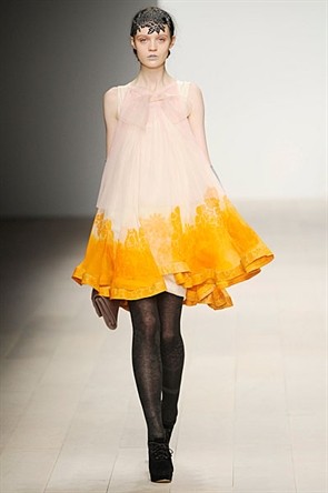 Necklines were demure as were the hems, the collection innocently feminine and avoiding the sexy styles that Bora Aksu has often used in the shows. Staying within trends the dip dye look hit the runway but with a textured print used for a slight twist. Sheer, draped chiffon layers were also added to many of the dresses and in slightly structured sleeves. As the collection evolved colour became more obvious in a fuchsia draped dress worn with a milk maid style head covering and toting black shiny buttons. Black neckties added a darker edge to the outfits as did black lace face masks. Clashing scarlet and burnt orange together was a theme as was a bold pairing of orange and pink which hinted at an oriental colour scheme.