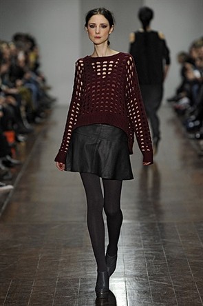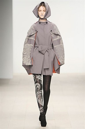 The collection began with a rather ‘yee olden days’ western theme, belted, long coats worn with wide brimmed hats over thick textured woollen blue/grey coats with strong piping. The winter ready outwear opened into another show of bright red and orange clashing wonderfully and appliqué over mesh, hinting at flesh. Cut out shoulders and leather elbow pads added a country edge and hat was accentuated by ‘polo’ belts tied at the waist and Jodhpur like panelling in the leggings. The final outfits were skimpy a-line skirts and had a decidedly 60’s feel with the burn orange weaved delicately into muted knitwear.