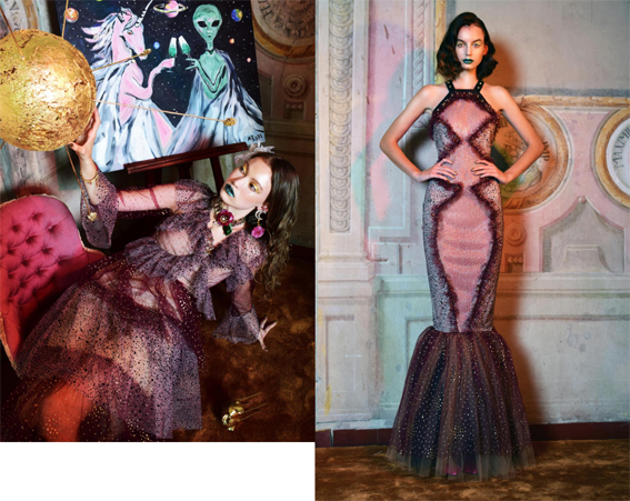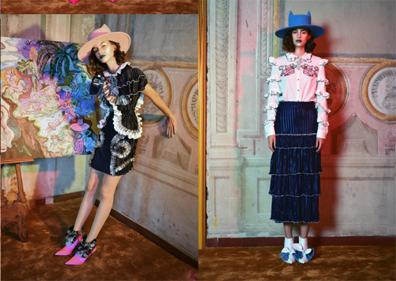 The designer frequently calls upon an accumulation of references including UFO cults, retro science fiction, the youth of 2000’s and old Hollywood glamour as well as Lynch, Fassbinder, Wes Anderson and Fellini women. These subjects are amalgamated into an innovative form of species who resonate as adventurers, heroes, ageless and curious individuals that journey through time and between dimensions, who subsequently radiate a fresh characterization of independence, freedom, dreams and fantasy.