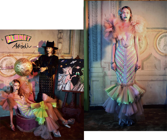 “Interstellar Congress” translates as a fantastical spectacle of avant-garde aesthetics, which are visually intoxicating and artisanally exceptional. The collection exudes an exuberant dichotomy of fabrications, colours and textures that result in unapologetically fabulous, ethereal, sensual and idiosyncratic styles and silhouettes. French dresses rendered with tulle and irregular signature dots, garments artfully reworked and embellished in imaginable ways, Swarovski crystals studded onto ABODI design patches with further accents of ruffles, applications and embroideries collectively contributes to the eclectic array of pieces.