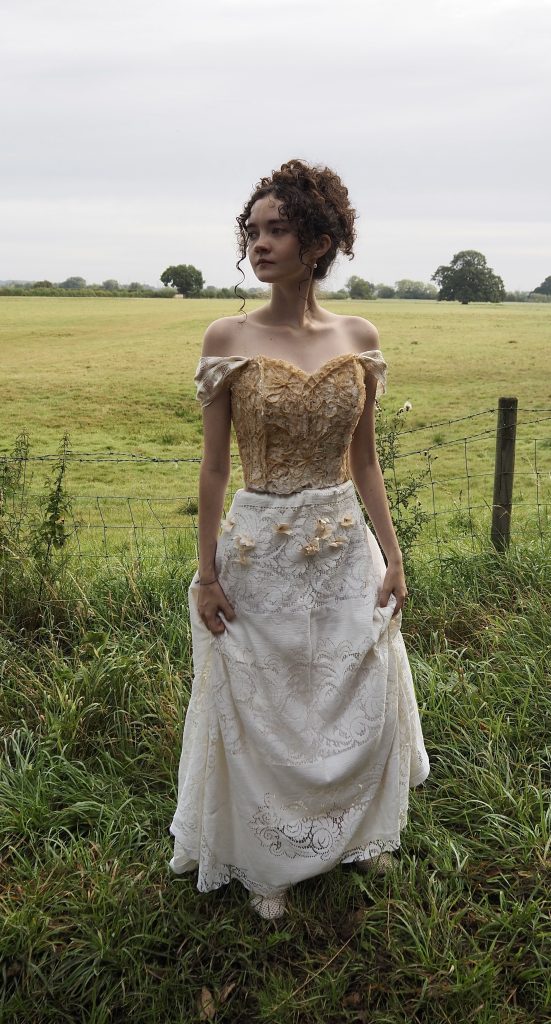 (Leah Gasson Compostable wedding dress. Bodice from grass roots and paper and seeds that will grow.)