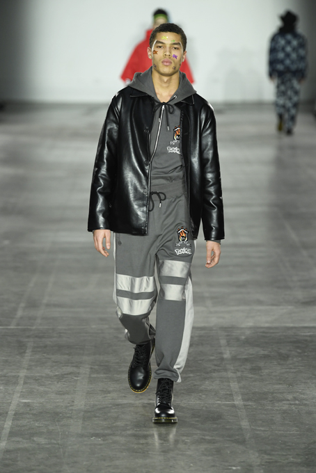 The designer’s characteristic sportswear-inspired and technical fabrics feature throughout, with the addition of corduroy wide-cut trousers, white vinyl cut in to jogging bottoms, and a blanket tracksuit with appliquéd leather lettering spelling out ‘Whatever Forever’ – the wording of one of Abley’s many tattoos. The show concluded with a special appearance from a life sized Pikachu, and why not, while the designer donned a black t-shirt stating ‘chill the fuck out’ in neon pink; how very Bobby Abley!