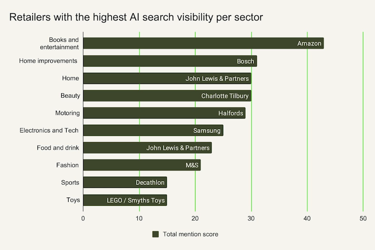 AI’s Christmas Nice List also revealed John Lewis & Partners shows up the most overall in ChatGPT, with 31 mentions across eight out of 10 sectors analysed.