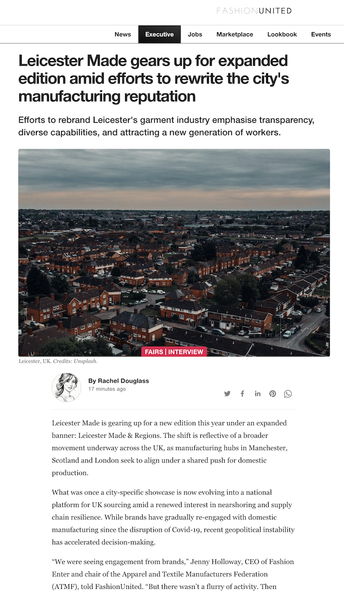 Rachel Douglass compiled a lengthy, industry-focused article: ‘Leicester Made gears up for expanded edition amid efforts to rewrite the city’s manufacturing reputation’ featured on FashionUnited.com.